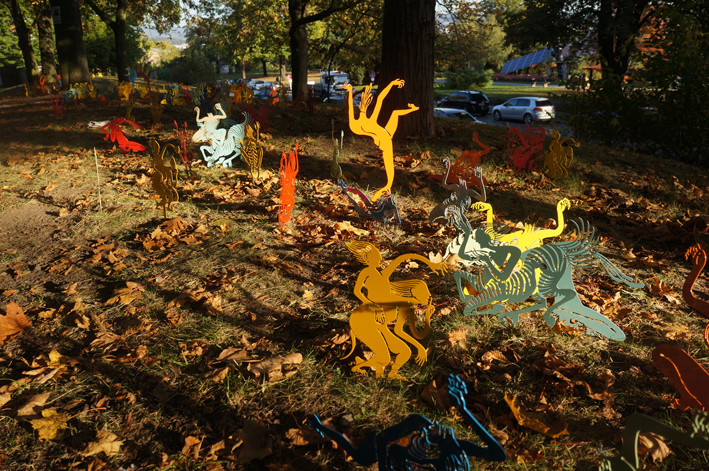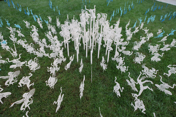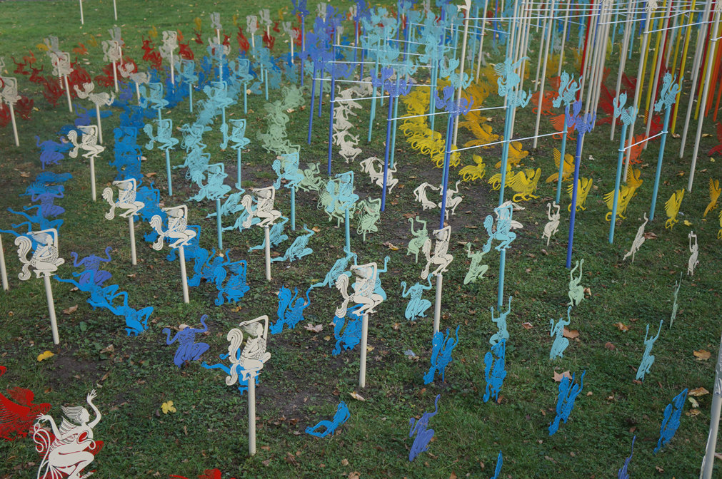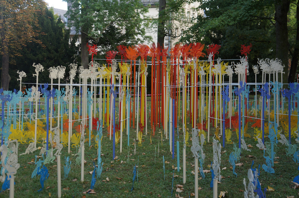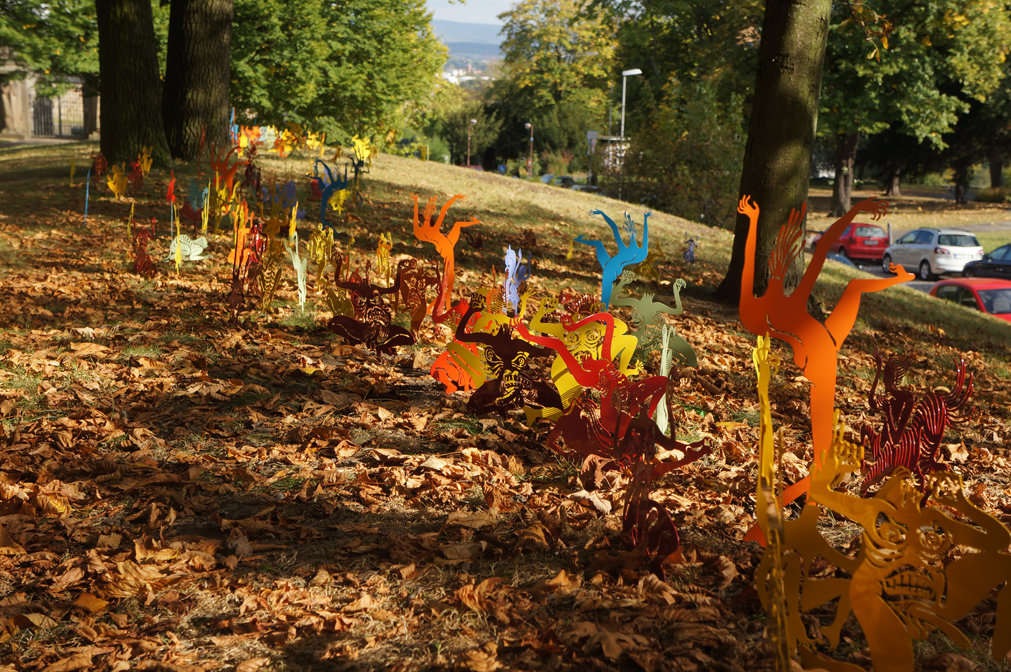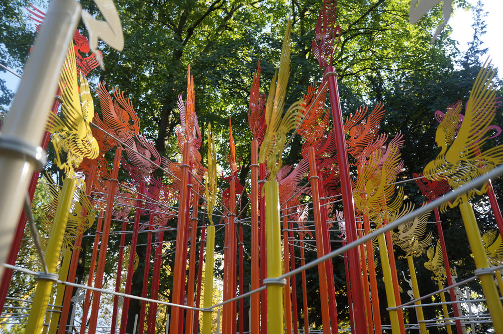 There are total 1200 pieces, they can be combined variously according to spaces. Each piece is of unequal size, the thickness of steel plates is 1.5mm, the approximate height of each piece is between 40 cm and 70 cm