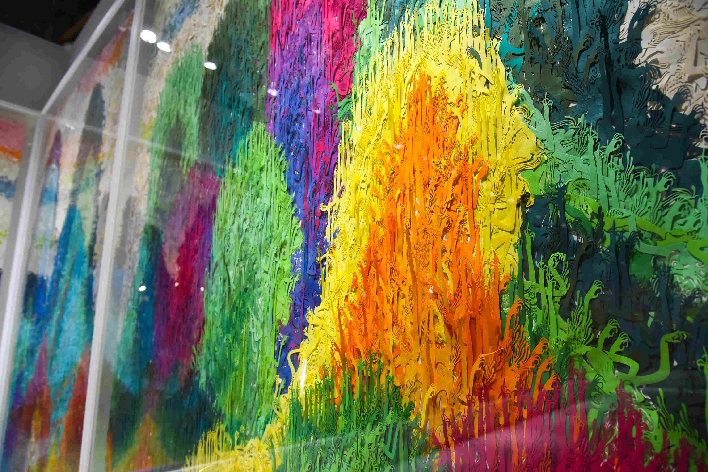 《大河的诞生》由剪纸拼贴而成,连接拼组成连绵不断的群山。这些连绵的山形似桂林山水,能够引发象形的联想。组成群山形象的是无头的“刑天”和其他来自《山海经》中的神袛,如句芒、丹朱等等。刑天与这些神袛形象视乎都在群山间疯狂的呼喊或舞蹈,试图找回其失落的头颅。