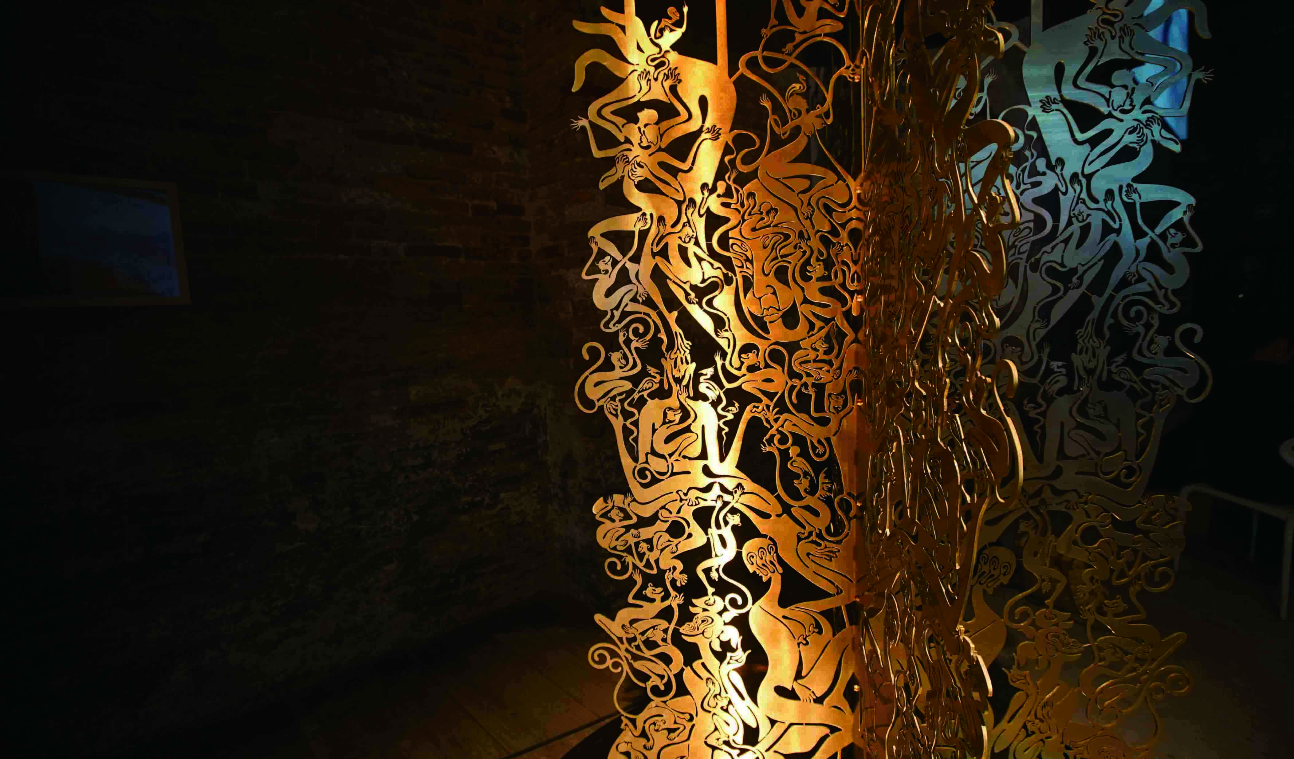 《白日梦的树林》由十七棵黄铜雕镂的树状雕塑组成,每棵树状雕塑都分为了两层,每一层都是一个单独的形象,邬建安称之为《白日梦》。这些形象是特殊时期伴邬建安度过恐慌的梦幻朋友,也是抽象的个体精神体验对灾难性的现实危机的一种回应,于是他们构成了另一种虽不可见却又“活生生”的真实。