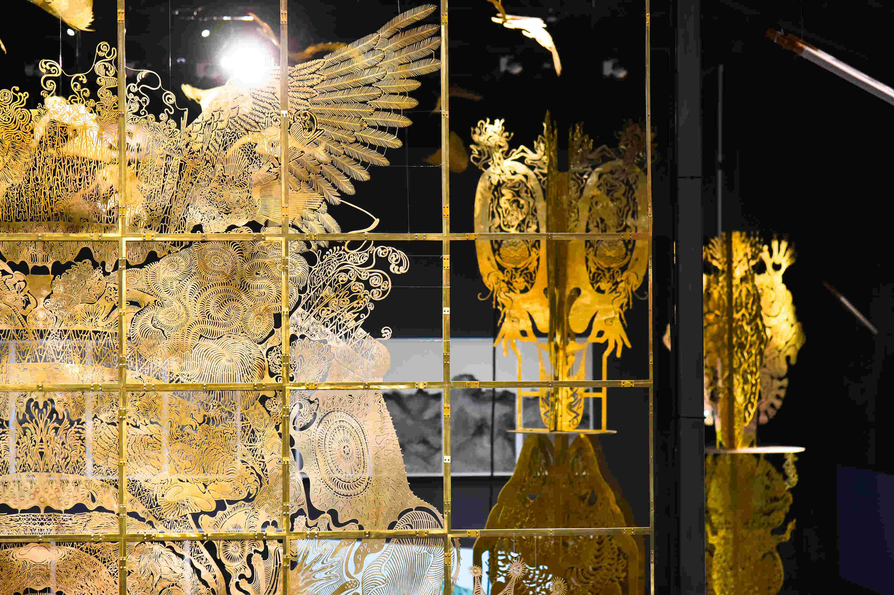 展厅之中,汲取“迷信”能量的当代中国艺术家邬建安、汲取大海能量的当代中国艺术家汤南南,雕刻影子的民间工艺美术大师汪天稳与汇集苏绣艺术传承脉络的民间工艺美术大师姚惠芬共同表达了“不息”所蕴含的“合作”与“传承”的精神气场,展览空间的“叙事”注入了更多的活力和可能。民间工艺和当代艺术家的创作在中国艺术的不息再造与重生的能量中相互渗透,构成互文性的集体创作网络——既有两点之间的交互,又有一点对多点、多点对多点之间的交互:邬建安与皮影大师汪天稳已合作多年,在本次展览中,二位针对马远《水图》和山海意象展开新的创作;而苏绣大师姚惠芬不仅以精湛绝伦的上百种针法再现《骷髅幻戏图》,也参与了汤南南《遗忘之海》的创作……除了每位艺术家分别与其它三位艺术家的合作,策展人和四位参展艺术家还集体创作了多媒体皮影表演《不息-移山填海》,作为中国馆的核心作品。在这片交叉合作的网络中,传统分别由当代艺术家和民间艺术家所继承和阐释。