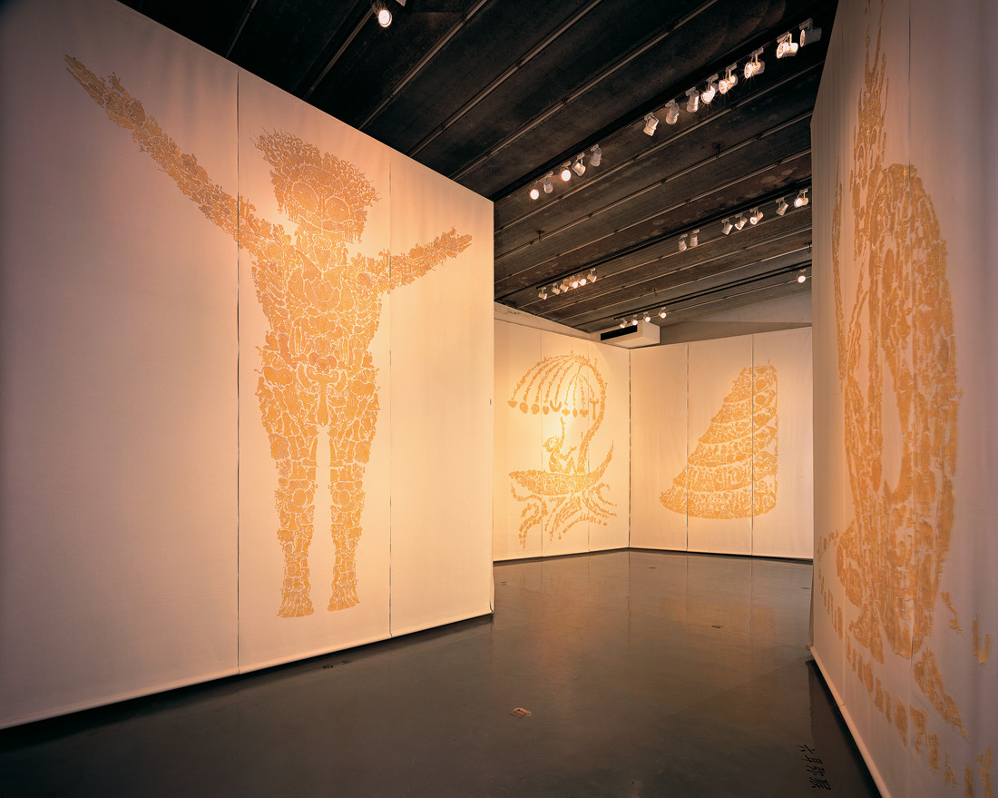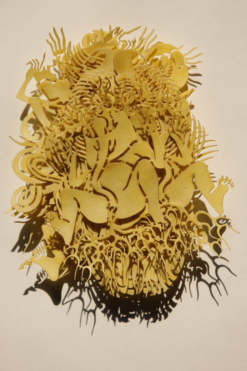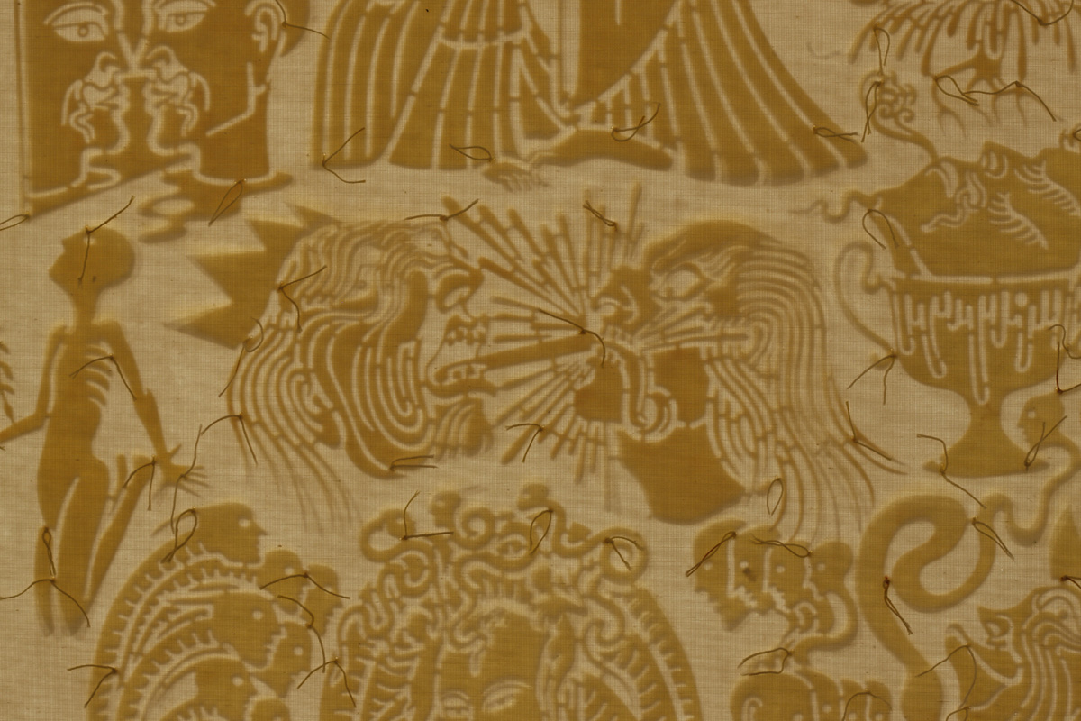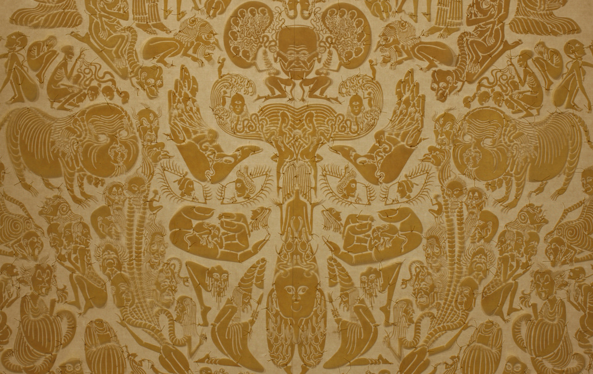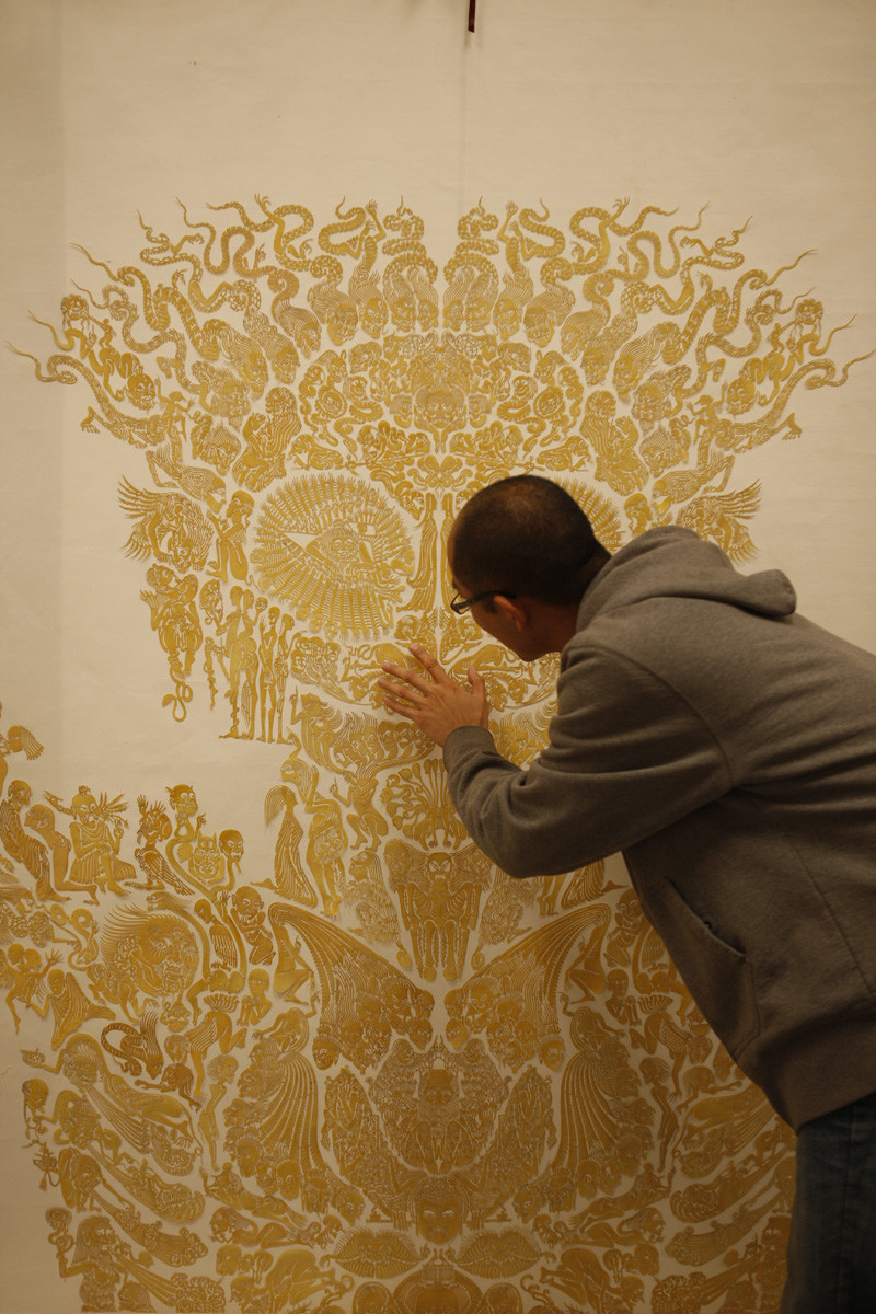 手工着色和浸蜡镂空剪纸,棉线,宣纸,绢