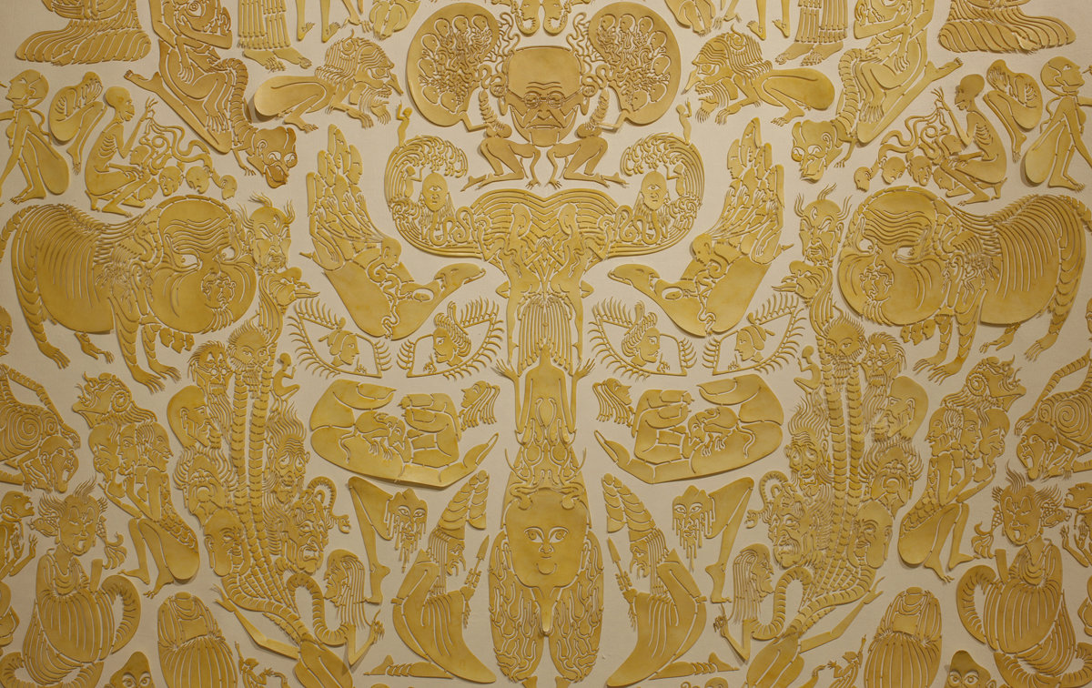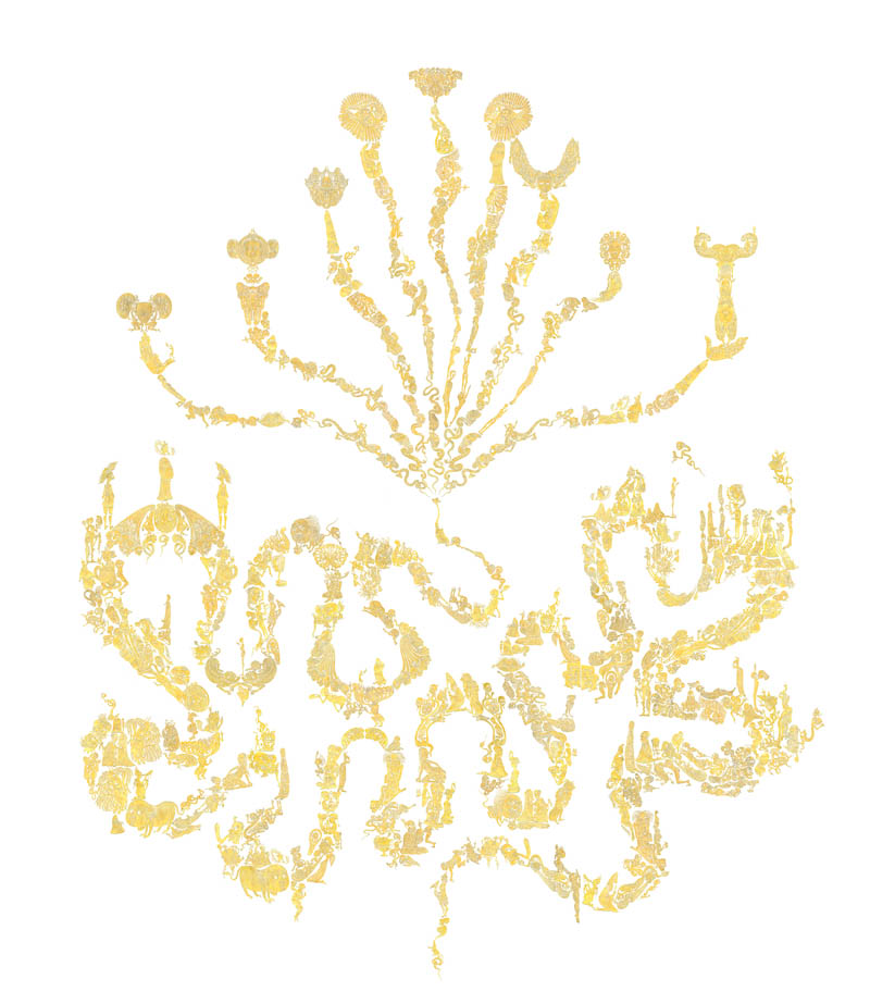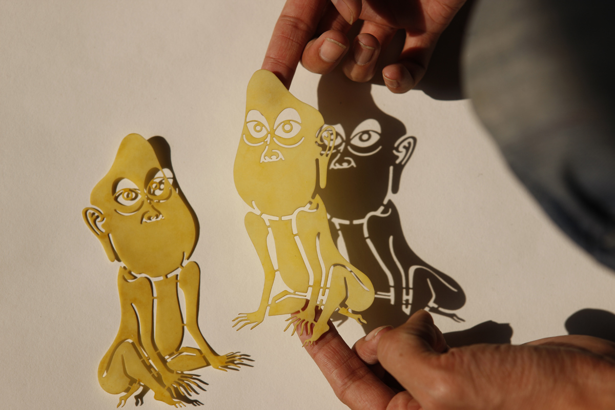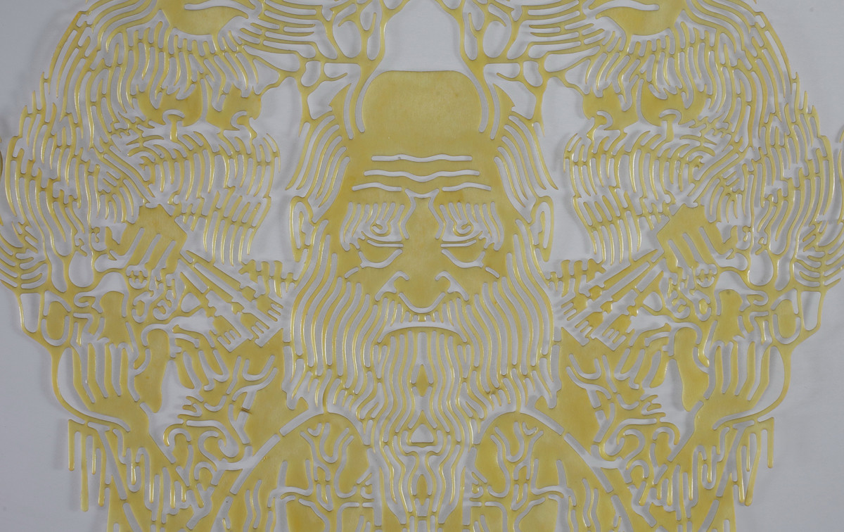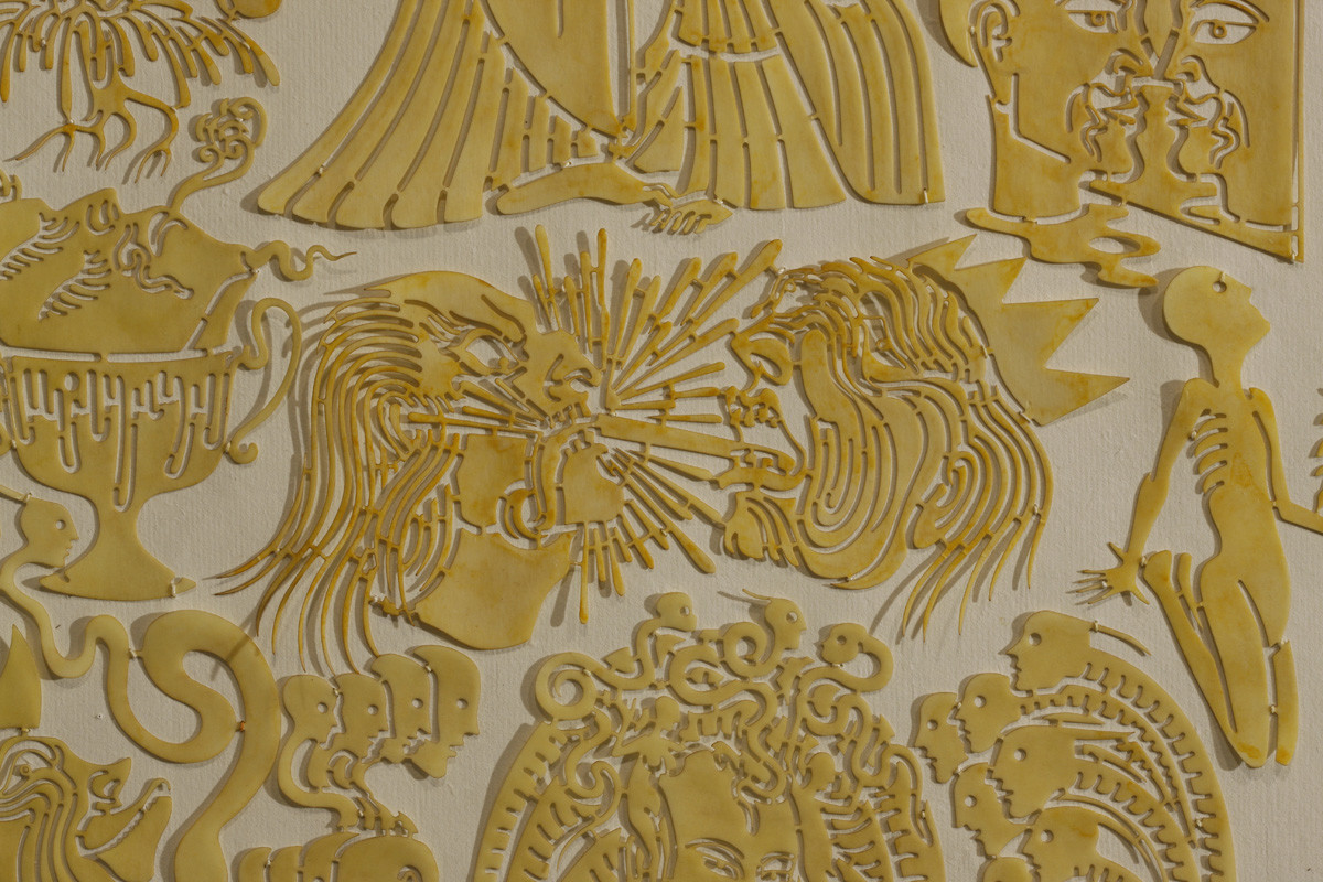 手工着色和浸蜡镂空剪纸,棉线,宣纸,绢