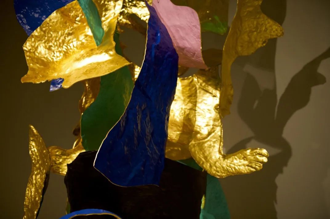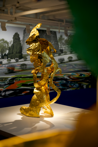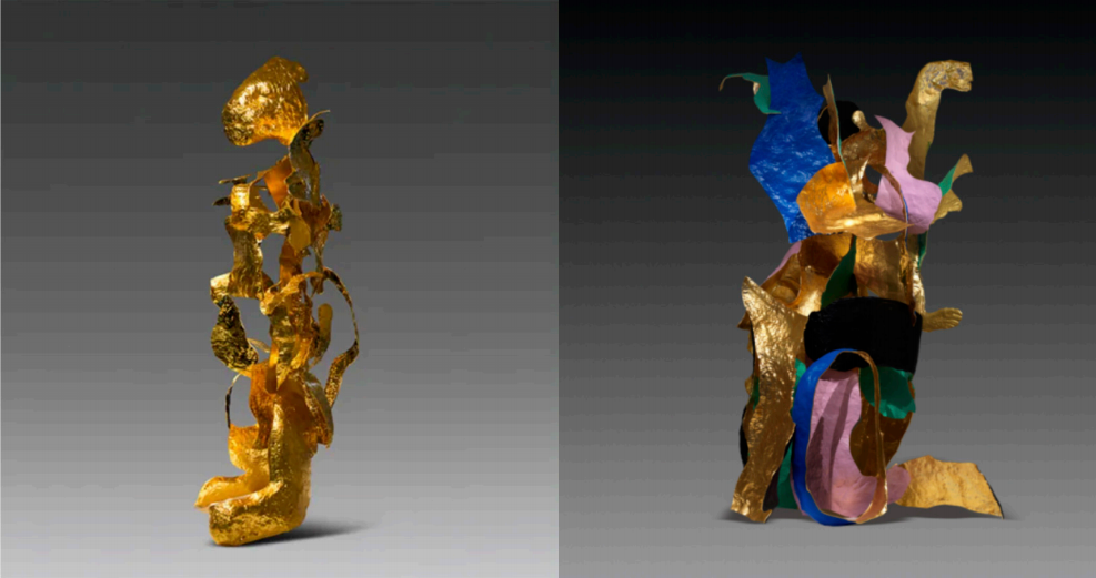 (右)《开壳——⼈与熊》,不锈钢、⾦箔、电镀、烤漆,82x240x130cm,2023年©邬建安