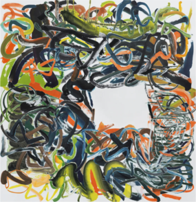 “五百笔”系列新作《与⽆字碑对话的五百笔⽅案》是为这个即将全⾯展开的五百笔项⽬的预演,是模拟各个⼯作环节的彩排。“五百笔是众⽣相,是众⽣汇聚的和声,是⼀个个灵魂⽆所遮掩的率真表达。”展览所在地数以百计的参与者留下了各⾃“下意识”的⼀笔,这些个体精神和⾝体特征的印记在艺术家审慎的营构间⽣成⼀⽅交缠、分享、争夺、共⽣的能量场域。⽽艺术家特别在画⾯中⼼设计的⽅形留⽩,正是对⽆字碑的拟象。