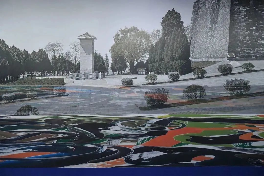 《与⽆字碑对话的五百笔⽅案》,纸本⽔墨、彩墨、剪纸拼贴,285×275cm,2023©邬建安