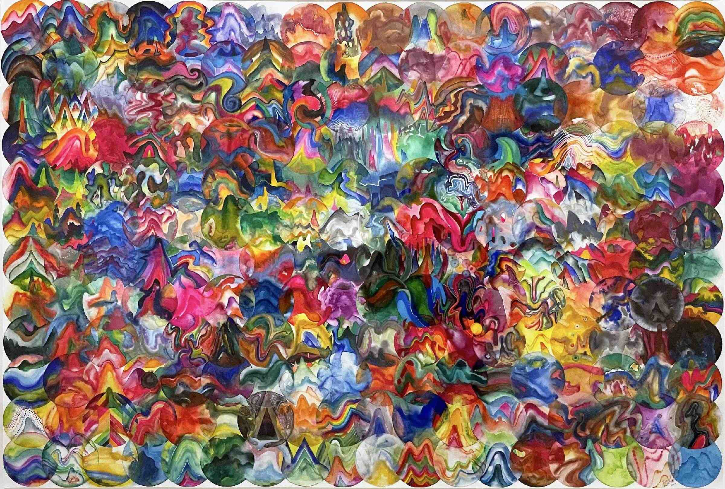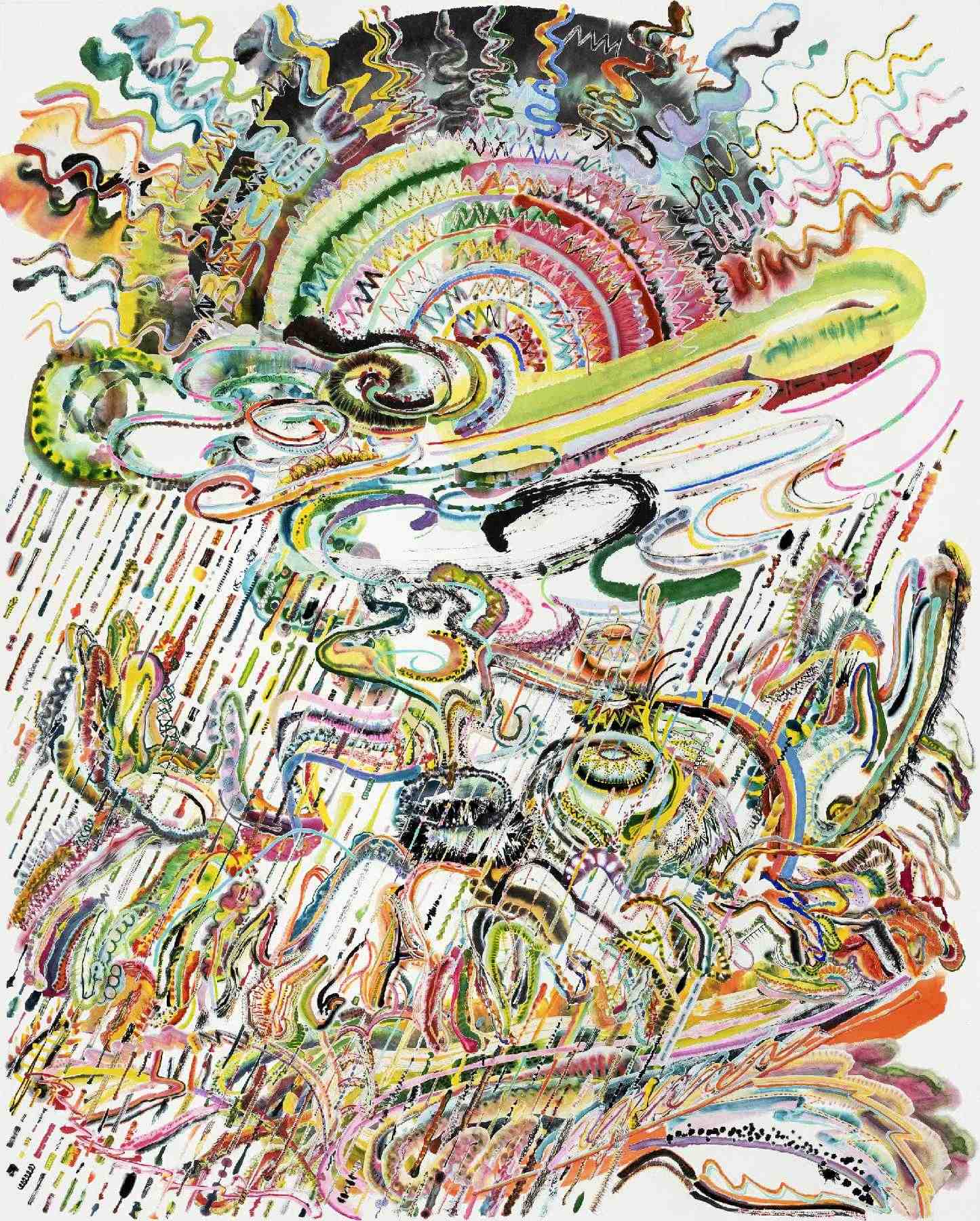 而在“无限绘画”系列中,艺术家在一定程度上将对“个体与群体关系”的表现结果拉回到“形象”中。他首先在草稿上完成一个轮廓清晰的具象线描,然后将画面中的每个点和线打碎,分解成为数百个绘画单元。这些一幅画中最小的单位被作为独立的个体进行重新描绘,最终被剪刻、拼贴,回到它们原本的位置。在这一过程中,绘画单元中的个体被艺术家赋予很大的自由,因而生成一个拥有夺目的细节的整体。远远的,具体的形象在画面中依稀可辩:骄阳、暴雨、云气、各种动物和人物;而构成它们的个体看起来既像是海洋生物的细胞,又像是宇宙的星云,每一笔抽象的形状和色彩超越了代表云雨骄阳的身份,指向对绘画的动作、媒介,以及交织着意识和下意识的绘制的回归与内省。通过从具象到抽象再回到“具象”的过程,个体尽量避免了功能和身份的干扰从而进入更纯粹的自我探索和表现,整体也因而保持了相对完整甚至拥有了更多对多样性及潜在的多元性的无限想象。
