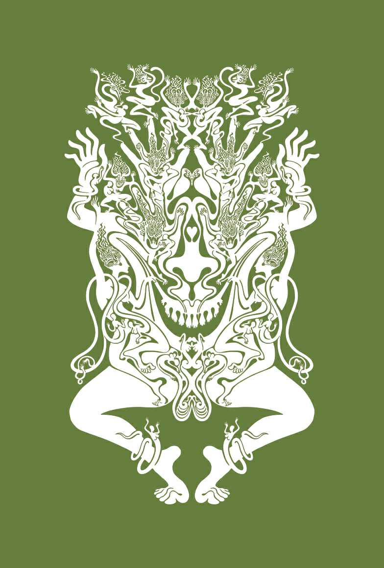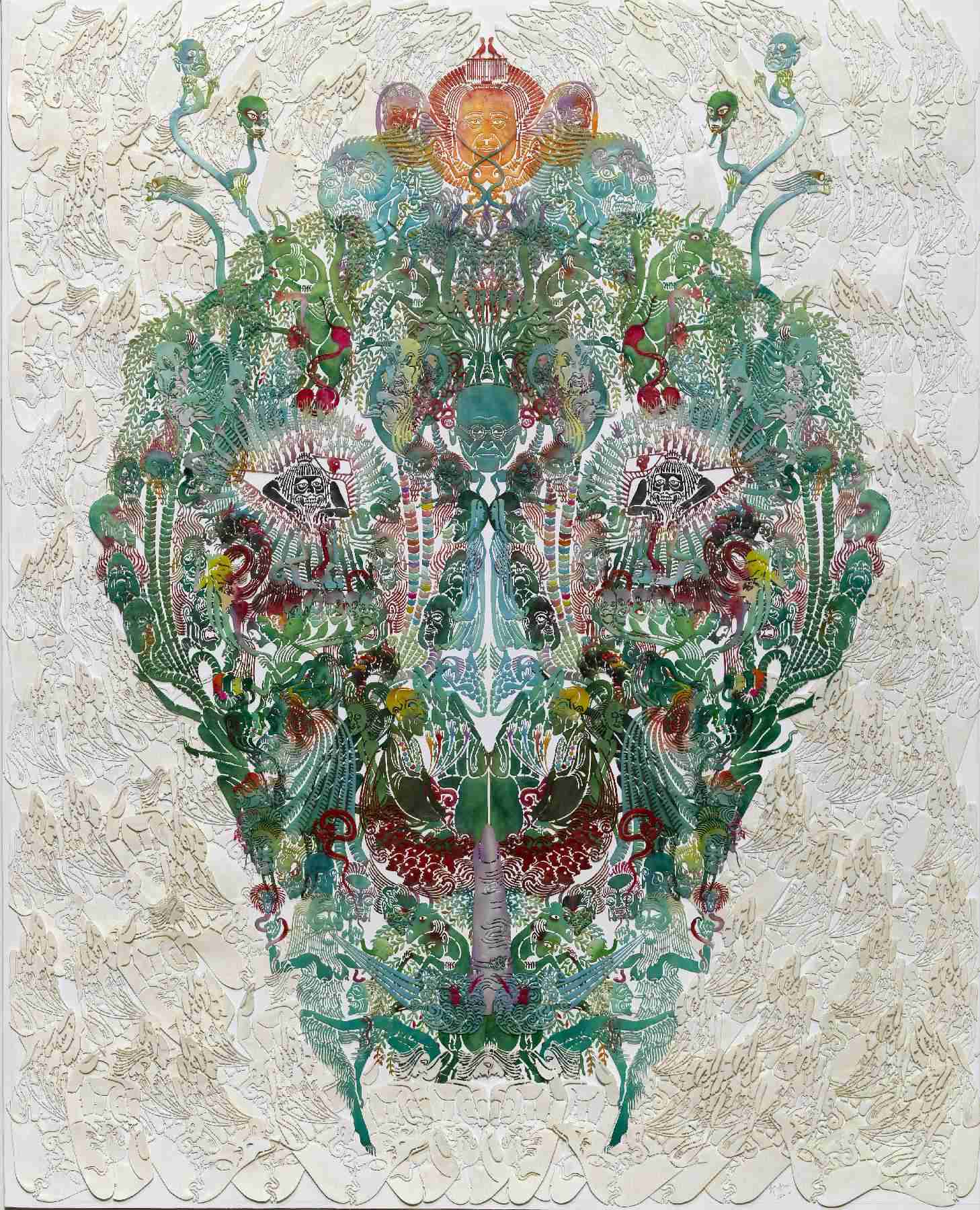 熟悉“化身”系列的观者会很容易发现,构成这些代表着自然秩序的动物肖像,由艺术家于2011年创作的《七层壳》中的形象拼组而成,这些小的形象共186种,可分成人体器官、神话或历史英雄、典故演绎、身体或社会行为、文学作品中的形象、隐喻之物以及虚幻的妖魔7组。这些“小人”在不同的作品中的数量、色彩、位置各异,如身体的细胞各司其职,与其所组成的微笑着的动物一同凝视着猎物以及我们。在某种意义上,《七层壳》可被称为艺术家的视觉辞典,而其所衍生出来的众多“化身”系列作品,通过反复实践一个原型在不同场景中拥有众多化身的方式,暗示我们所身处的现实世界也在某种循环中。