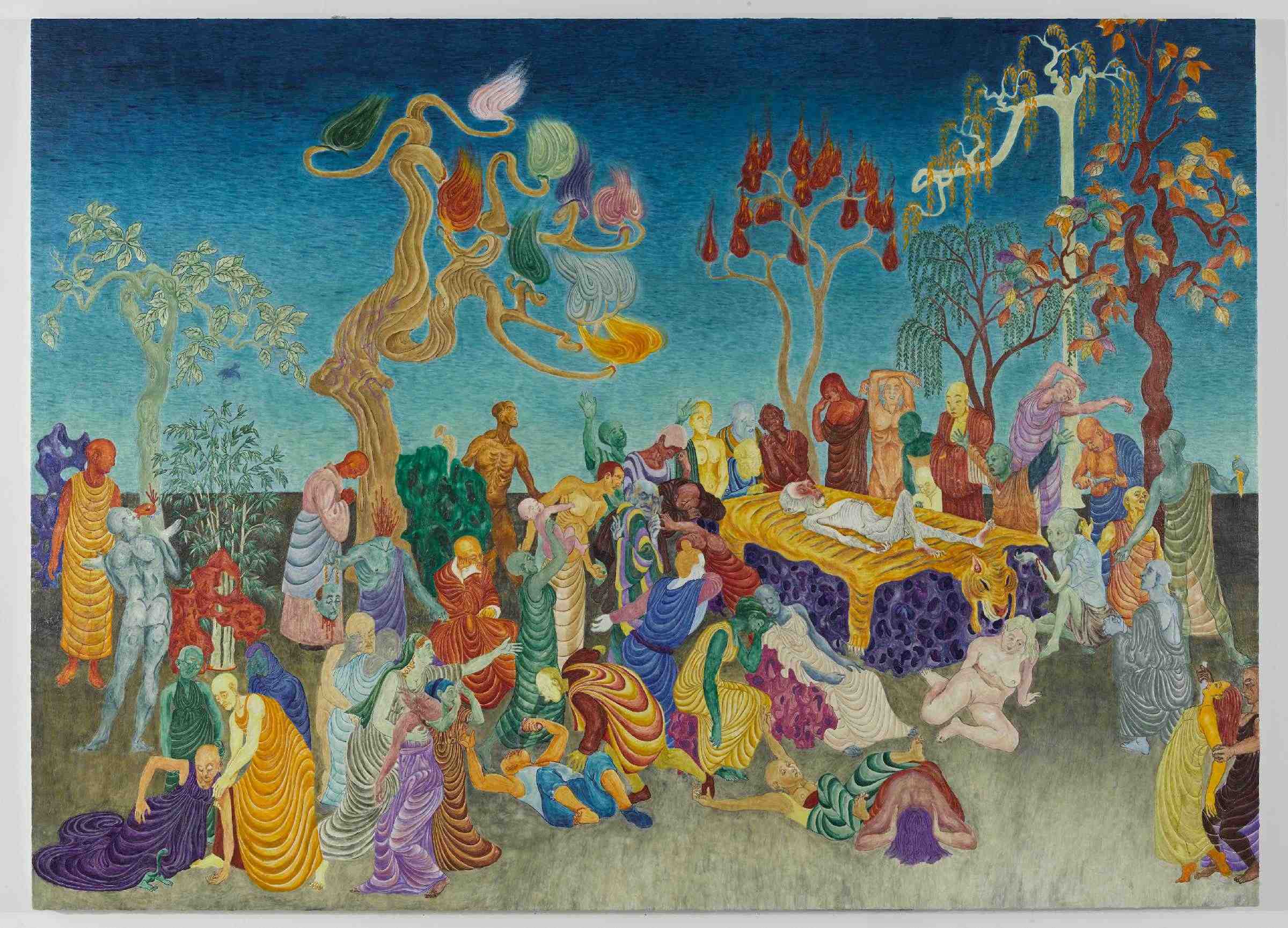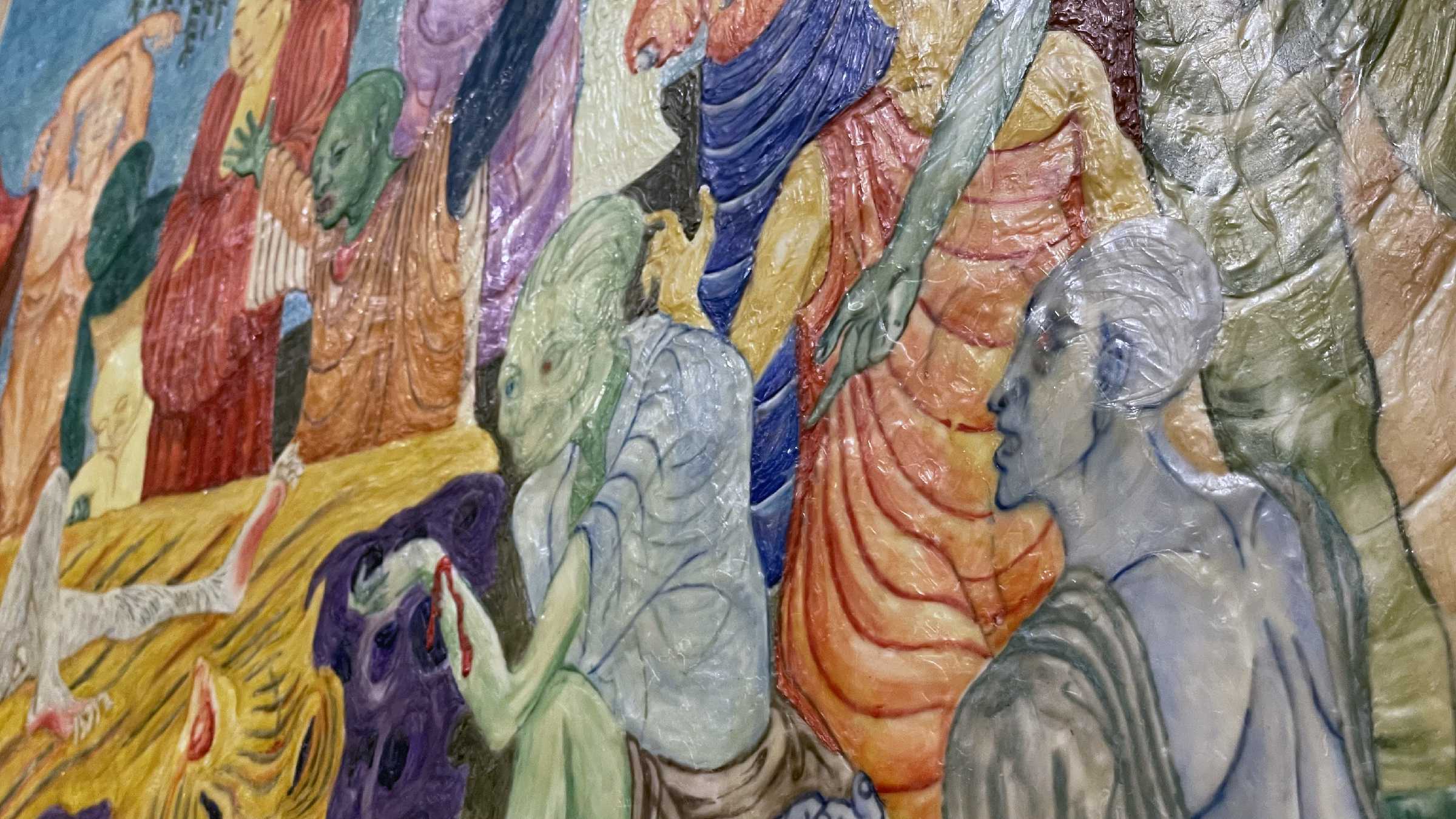 “蜕变”版块中的首件作品《白猿涅槃》,是艺术家对《西游记》中石猴诞生故事的重新构想。画面中的各色人等带着中、西方各种救世故事和经典绘画的影子,一只年迈的白猿正在他们看似悲痛的表情注目中等待涅槃。艺术家以此为开端,两个方向分别绘制出三幕逐级放大的“情节”:一边是具象的脸的放大,在“造人”的实验中思考人的面貌与人群之间的状态;另一边是抽象的点的放大,在颜色和形式的游戏中探索独立与共享的秩序和边界。层层递进的放大过程就像爆炸一样,各自完成了一次对猴王出生的回溯。