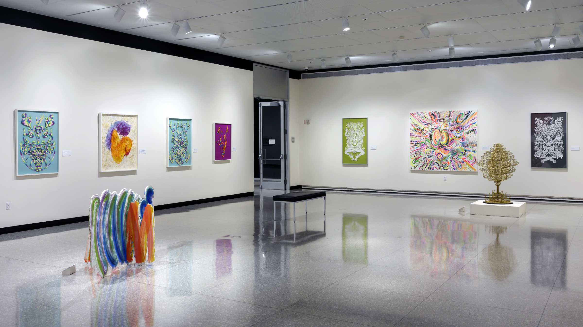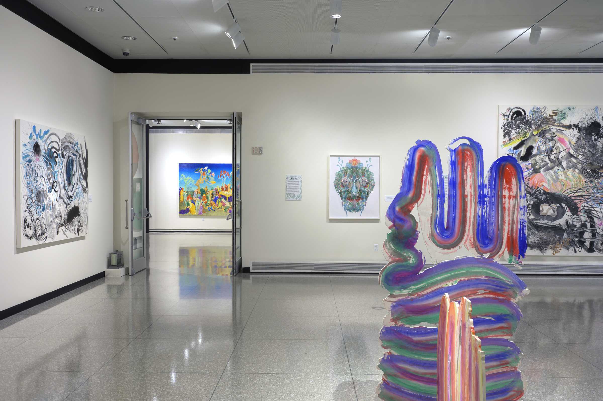 作为艺术家邬建安在美国举办的首个大型美术博物馆个展,本次展览结构了“白日梦”(Daydreams)、“虹”(Rainbows)、“面孔”(Faces)、“面具”(The Masks)、“蜕变”(Transformations)和“五百笔”(500 Brushstrokes)6个主题版块。突破编年史和线性叙事的逻辑,展览没有标记起点或终点,各版块也没有规定先后次序和明确的边界,本次展览的策展人、卡拉马祖艺术中心策展总监雷赫玛·C·巴伯(Rehema C. Barber)通过精心构筑的空间叙事,强调各种年份、主题和媒介的作品间的融合与呼应,在两个主体展厅中编织起艺术家若干代表系列作品的共鸣回响。
