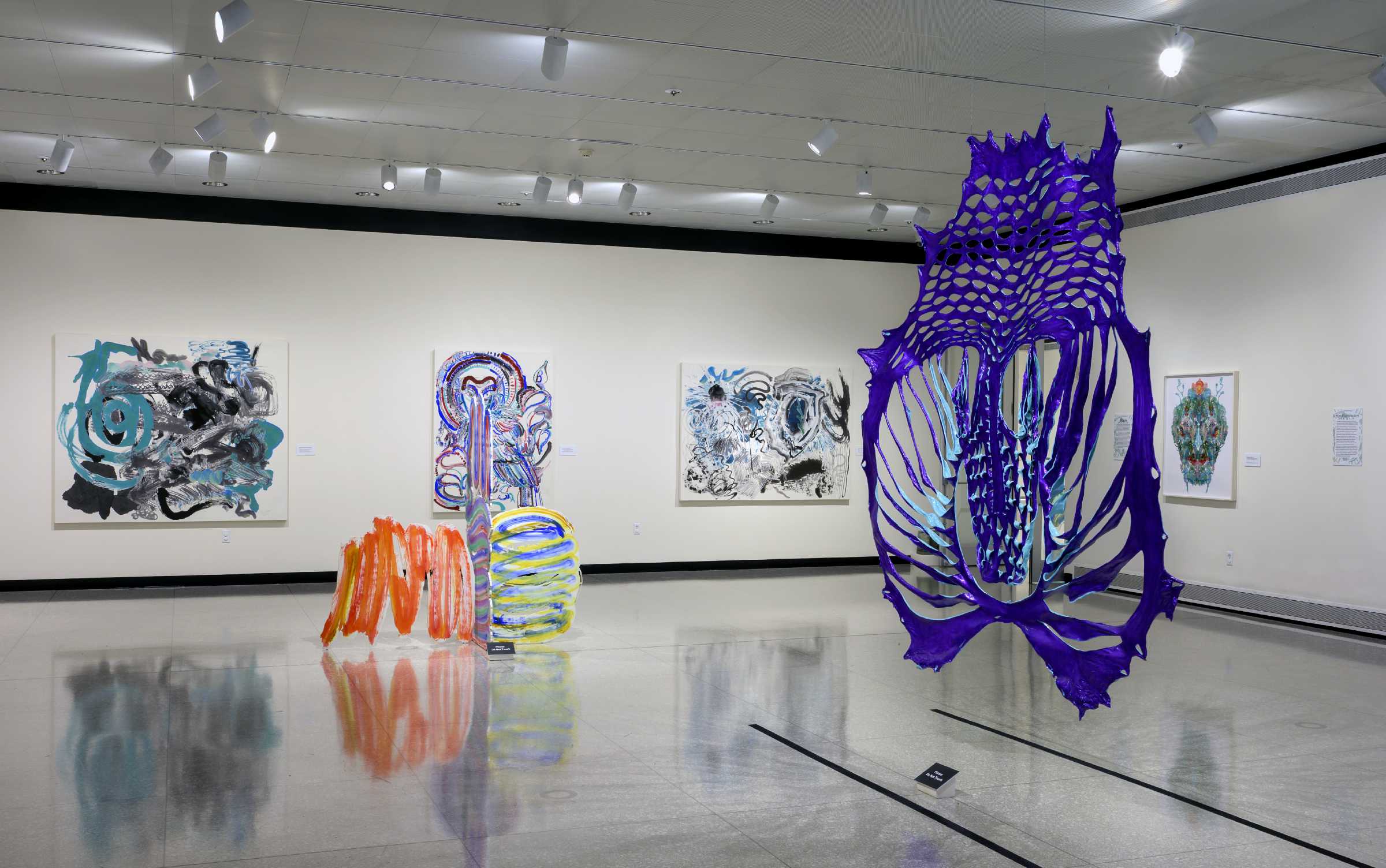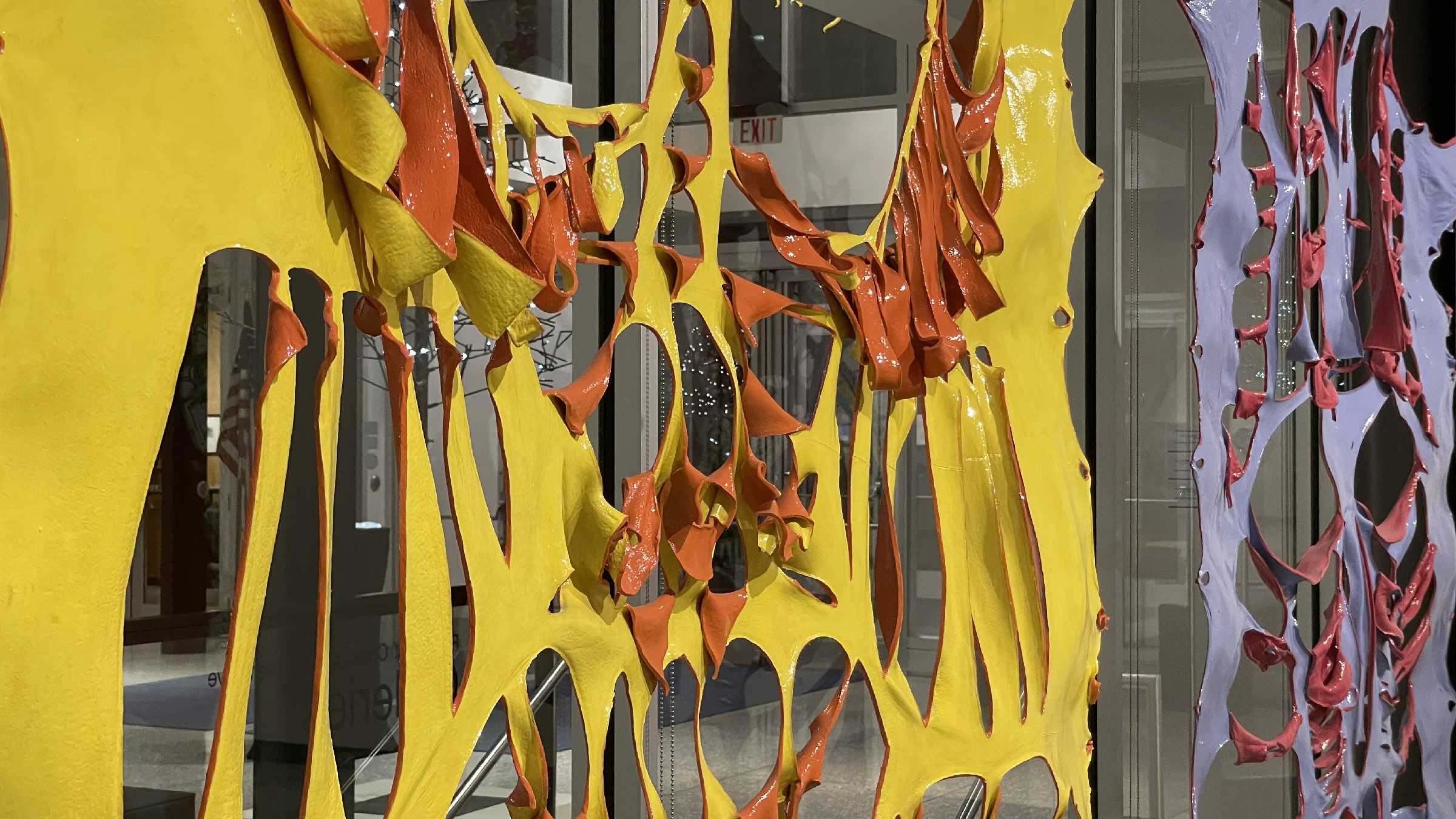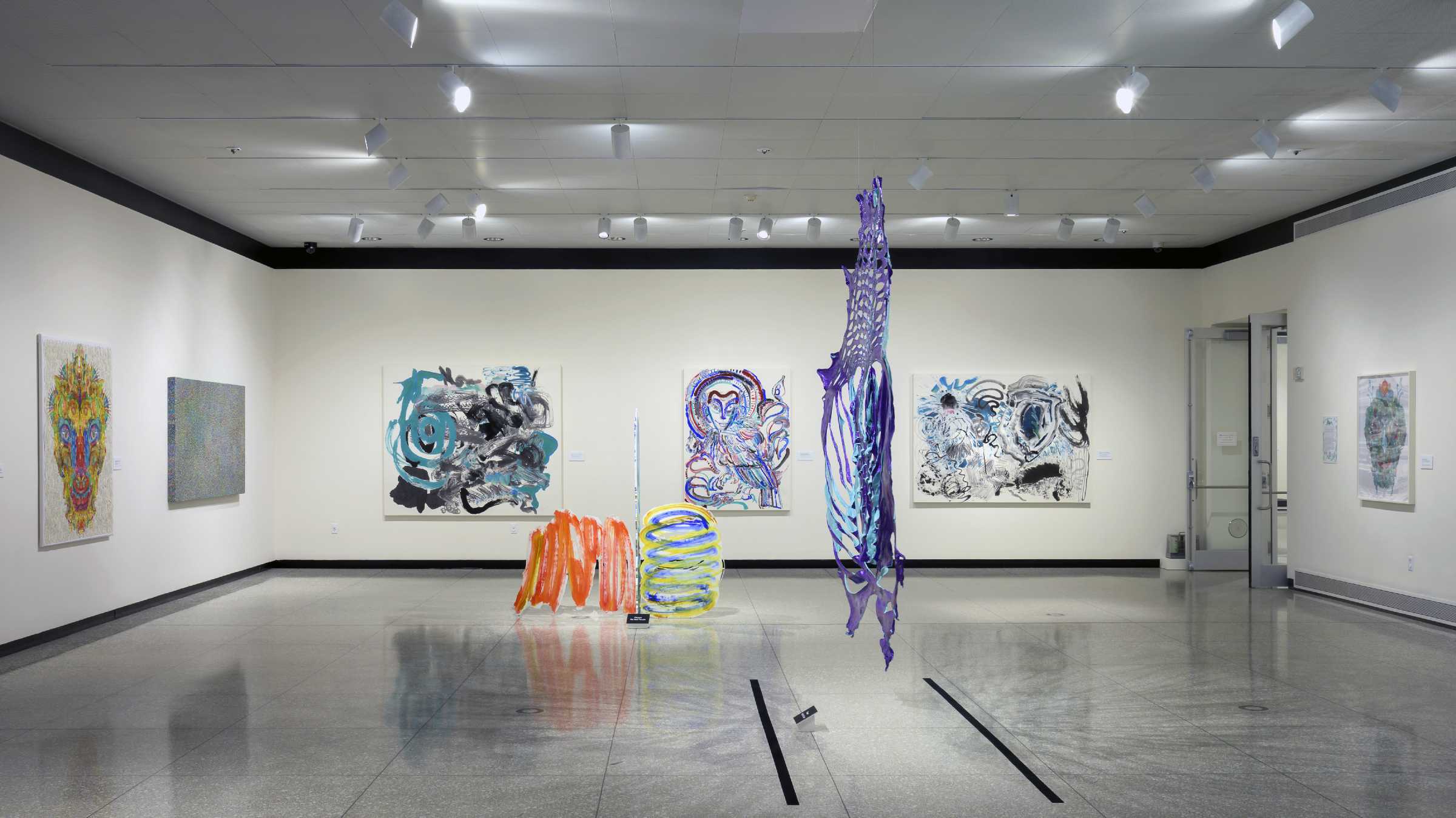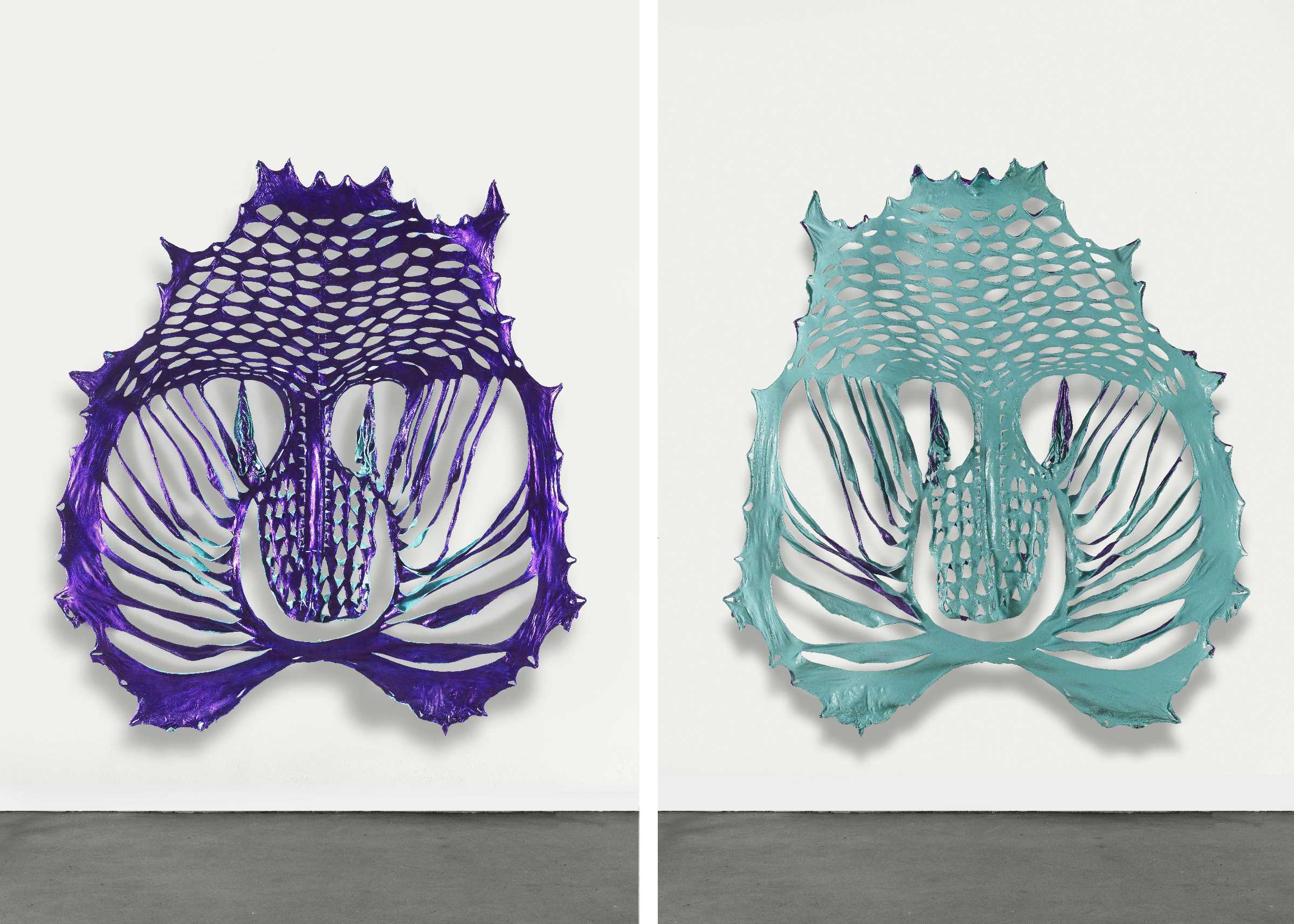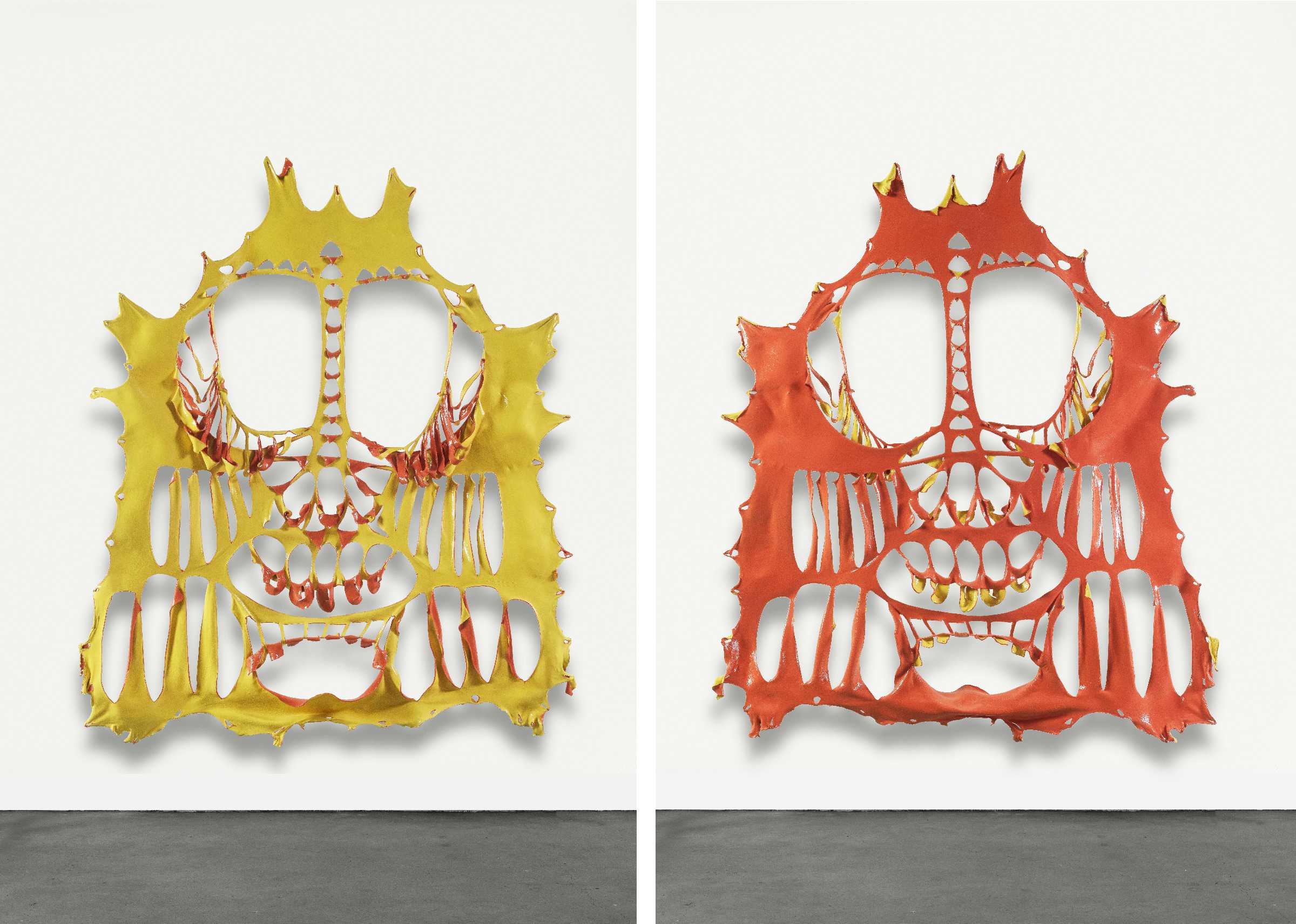 第一个主体空间于醒目处悬吊着若干件“面具”系列作品。在这个2018年开启的系列中,邬建安延续了对皮张材质的使用,以及通过镂刻进行个体表达标记的创作方法。创作时,艺术家直接在泡涨变软的回收牛皮皮张上留下大小不一、形状不同的切口,随着牛皮脱水、干燥,人为设计的切口形状变得面目全非,整体上越来越像古代玛雅、迈锡尼文明的面具,或者石器时代被提炼和图案化的面孔图腾。鲜亮的色彩“改换”了作品的材质,进而赋予作品某种超自然的形态转换:超越终会腐朽的物质媒介,与过去的文明对视。与此同时,作品也显现了人与自然既博弈又合作的复杂关系,同时也记录了人在与外界相处时或多或少的破坏欲,以及这些行为的徒劳——结果往往无法被追逐、设计、强加或者预见,只能通过在我们周围展开的复杂的成像来体验。