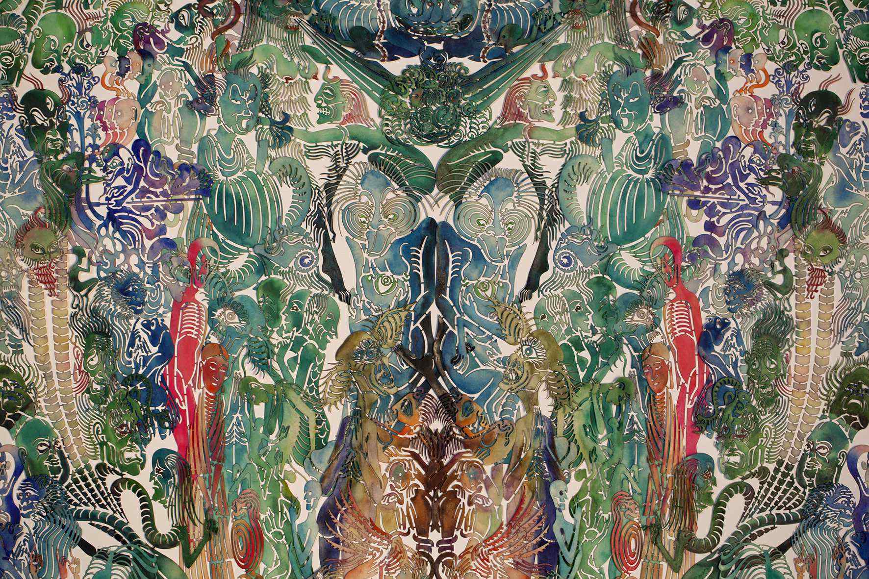 不仅仅将无数奇人异兽显现在我们面前,还把众多脍炙人口的古老传说编撰成一个个当代寓言。如果说,在他早期的作品中,艺术家剪纸表达了对隐藏联系模式的迷恋,在《白猿涅槃》当中,艺术家则通过运用了风格化的人物语言,在《变迁》中,吴以中国经典文本《西游记》中的一个情节为灵感,创造了一个使用彩色蜡和水彩等不同媒介的环境,以表达他对这一传奇故事的独特解读。在他早期的作品中,吴通过常常使用单个元素的不同组合来揭示神秘的真理。在描绘白猿的涅槃时,吴运用了风格化的人物语言,反映了他对经典佛教艺术的深厚理解。为了表达这一时刻所产生的爆发性能量,导致人类和宇宙万物的创造,吴创造了一系列作品,将人类和动物形态的重复描绘与抽象对应物相结合。
